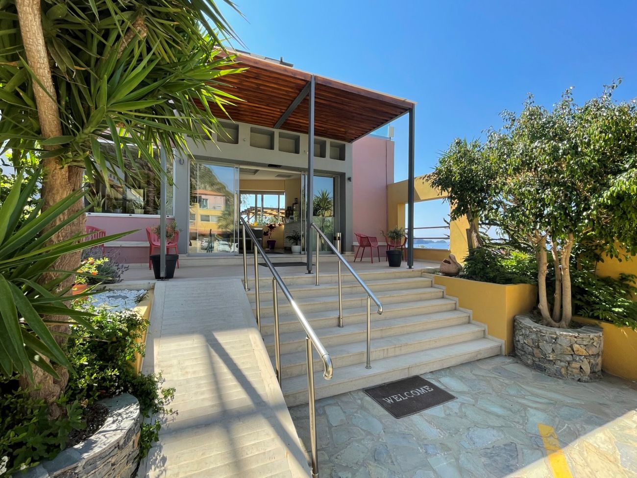 • Superior Room with Sea View (25sqm) can sleep 3 in a double and single bed and is situated on the first floor. Panoramic sea view from its veranda, which also has sunbeds.