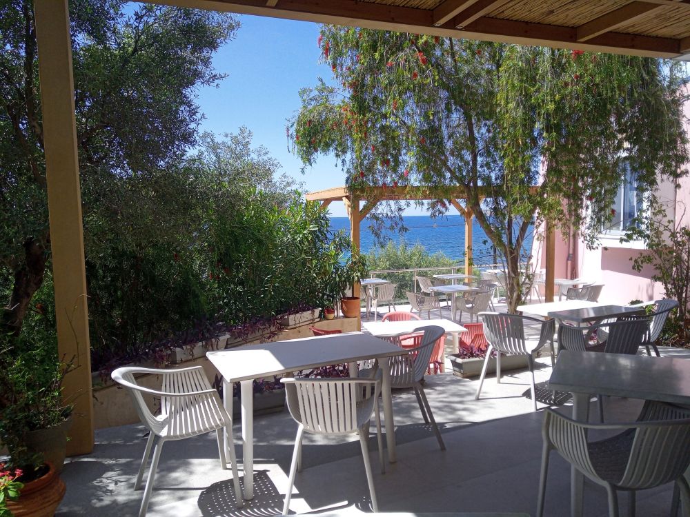 •  Double Room with Side Sea View (18sqm) offers veranda with side sea view. Studio with Terrace (20sqm) can take an extra bed for a child. Veranda with side sea view.