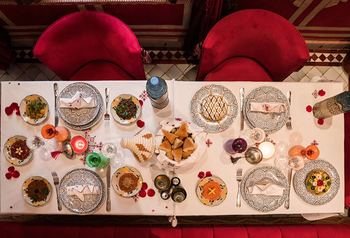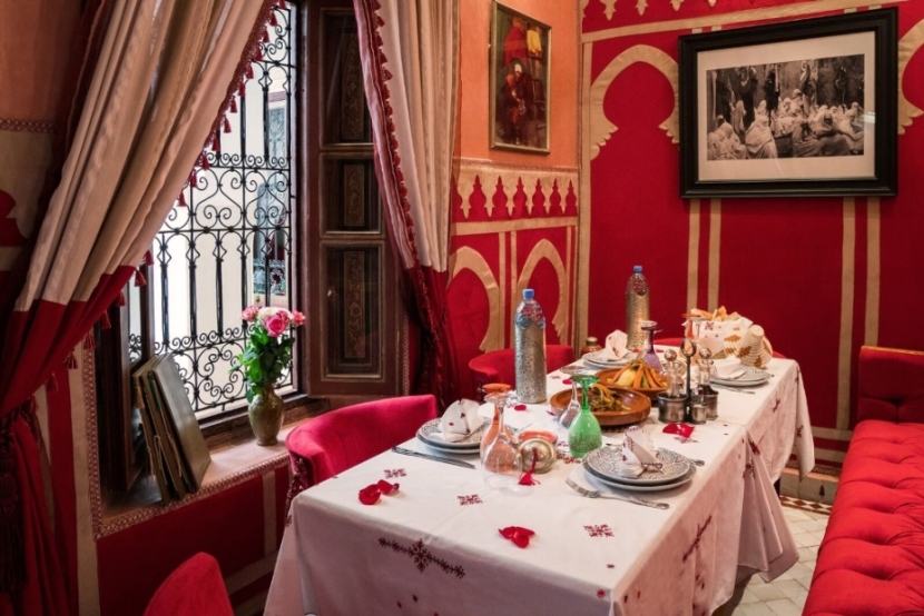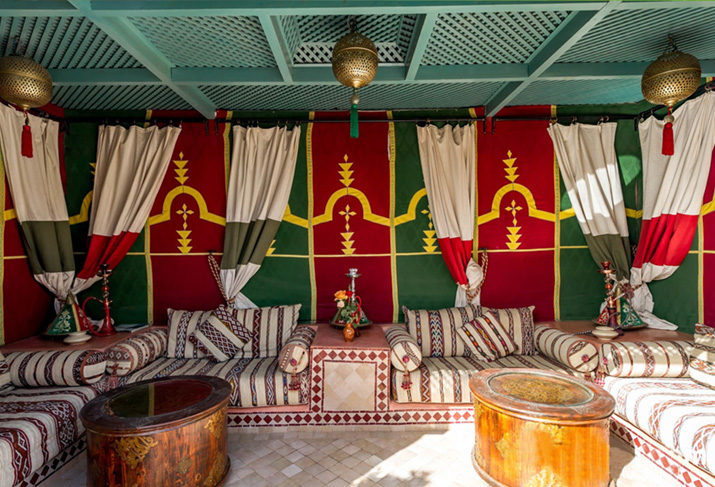 Dining is available on the roof terraces, one of which has its own tagine oven and grill. These terraces are planted with orange, lemon, grapefruit and pomegranate trees and offer superb, open views onto the snow capped Atlas mountains. Sunbathe under a clear blue African sky or relax in the cool shade of the Caidale pergolas. As evening falls, prepare to dine as the sun sets to the accompaniment of the evening call for prayer.