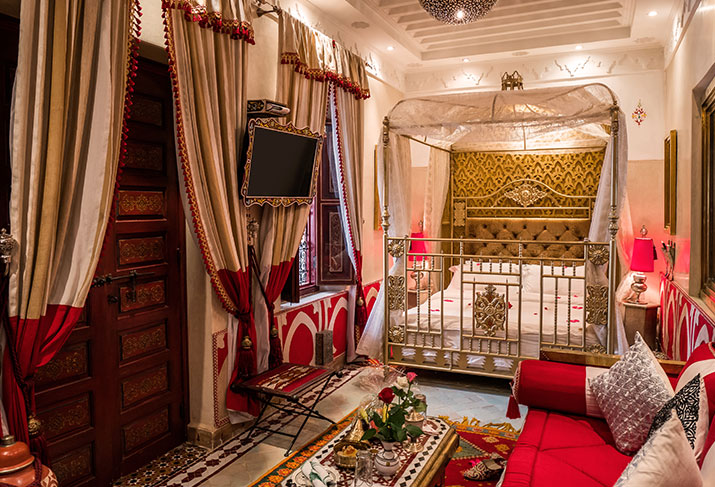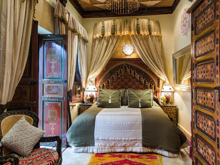 Ikhlas (Arabic: sincerity) is on the first floor of the riad overlooking one of the central courtyards and pool. An elegant, textured canopy of handmade fabric, muslin and traditional tassles frames the bed. The room is furnished with antique berber carpets, copper mirrors, zelij tables and a copper sofa upholstered in a luxurious fabric. The stylish bathroom has hand painted zowwaq walls, red zelij floor and a beautifully sculpted tadelakt and zelij shower.