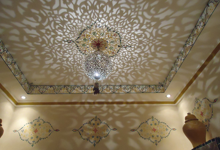 Karama (Arabic: dignity) is one of the smaller double rooms but neverthless beautifully proportioned with a decorative bathroom. A zowwaq painted and hand sculpted 'muqarbas' - a traditional, geometric patterned bedhead - along with a canopy fashioned from desert silk, muslin and tassles - brings a touch of romance and theatre to this charming room. Antique carpets and velvet chairs complete the luxurious feel. The large bathroom has a handpainted & mirrored feature wall & domed shower.