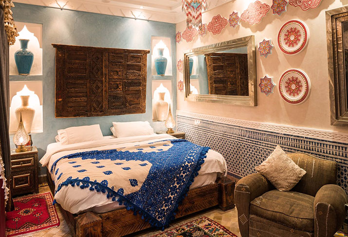 Rahma (Arabic: compassion) is on the first floor of the riad overlooking the smaller, mirrored courtyard. The traditional bed, fashioned from tadelakt and zelij, is framed by a hand carved 'muqarbas', or bedhead, with an ornate zowwaq finish. Cactus silk curtains line the tadelakt walls and frame the artisanal, wooden shutters. Hand painted plaster motifs, soft kelim armchairs and vintage Berber carpets complete the luxurious feel. The bathroom offers a sunken, hand painted tadelakt bath and a monsoon shower crafted from zelij and maillechort, a metal favoured by Marrakshi artisans which in English is known as nickel silver.