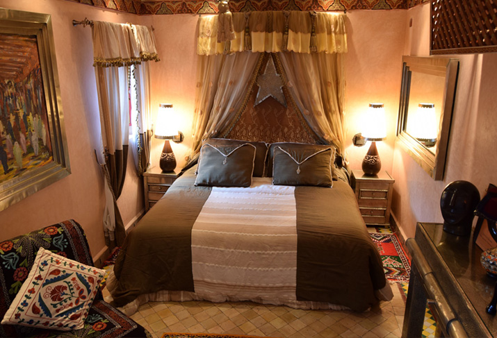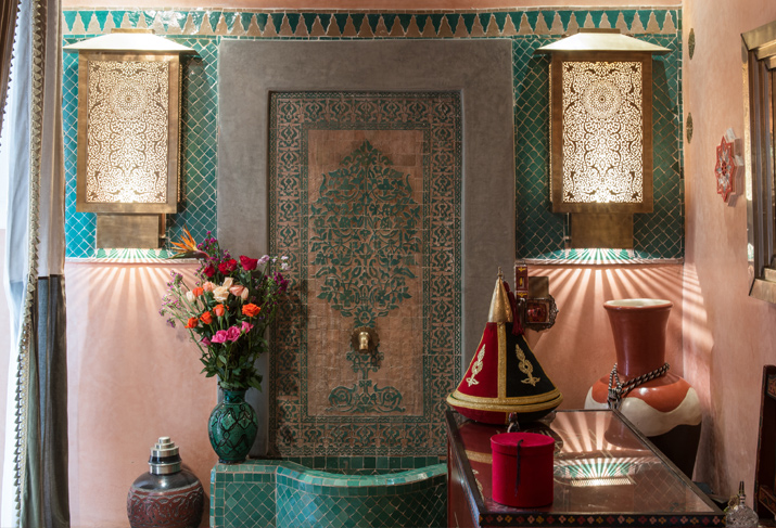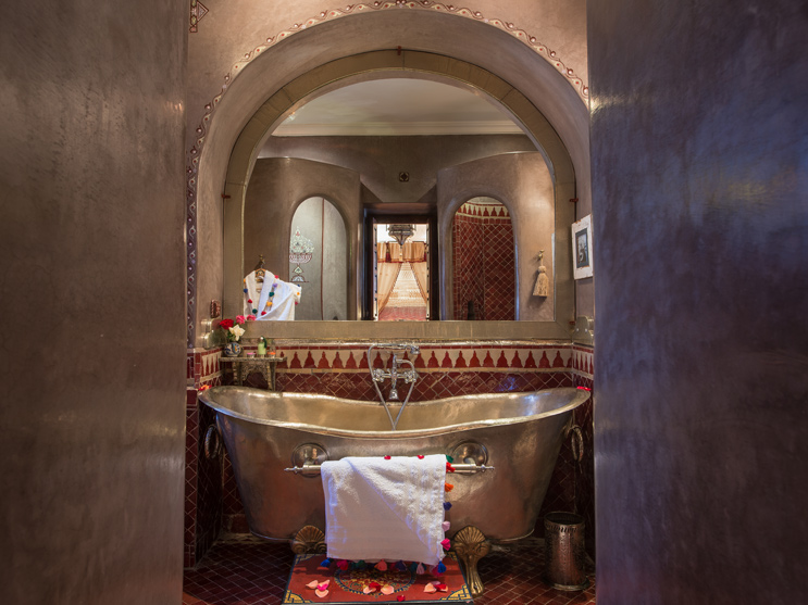 Amal (Arabic: hope) is on the first floor of the riad overlooking the smaller, mirror lined courtyard. A traditional canopy made from cactus silk and muslin along with hanging tassles adorns the king size bed. Soft kelim armchairs, vintage carpets and an antique silver writing desk creates a comfortable ambience. This feeling is enhanced by the large teardrop shaped, tadelakt fireplace (the staff will light a cosy log fire during the cooler months). The spacious bathroom is finished in tadelakt and zelij tiles & has a deep copper bath as well as a monsoon shower.