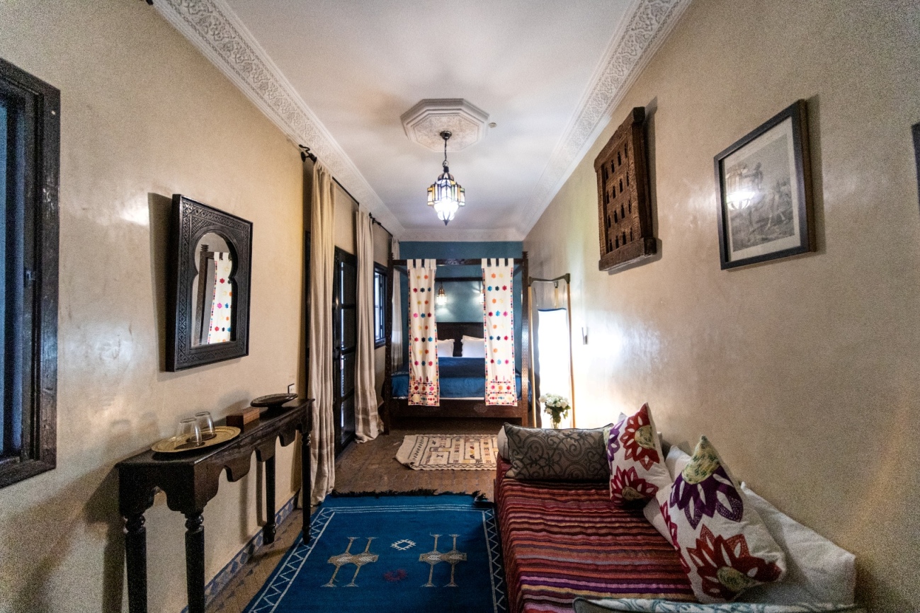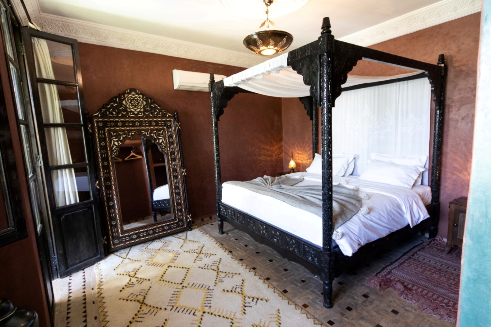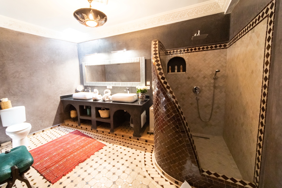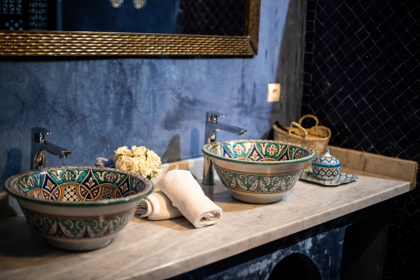 The riad has six rooms/suites, each of which has been designed with guests’ comfort in mind. All rooms are spacious with en-suite bathrooms; furniture is either hand made or sourced from local antique markets. Everything in the riad is made using the best craftsmen in town. The bathroom walls are protected by tadelakt, the traditional hammam material. Floors are adorned by zellige and bejmat and took weeks to cut and create.