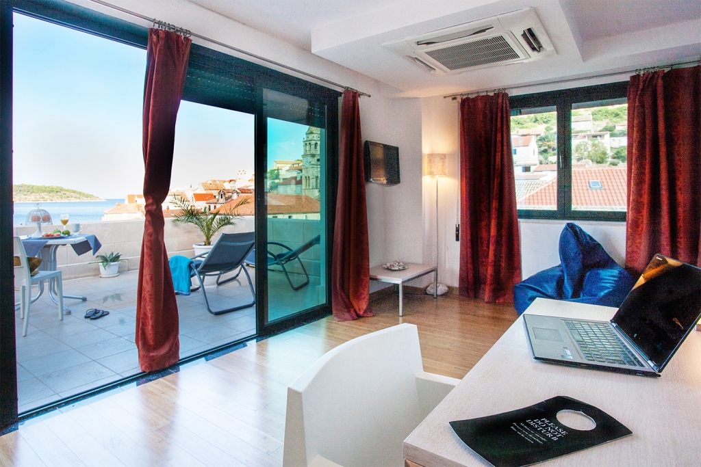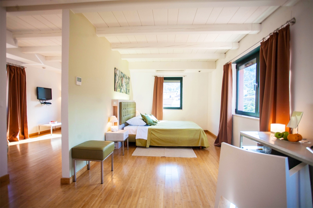 Rooms and suites are designed in a modern yet cosy style, each featuring a king-size bed. There are a total of 6 junior suites, 3 double rooms and a deluxe room with a terrace and a Jacuzzi. All of them have private bathrooms, wireless internet connection, air conditioning, satellite television, telephone, mini-bar, safe-deposit box, hairdryer.
