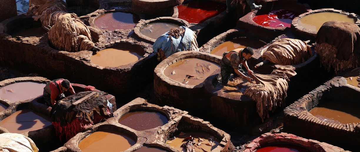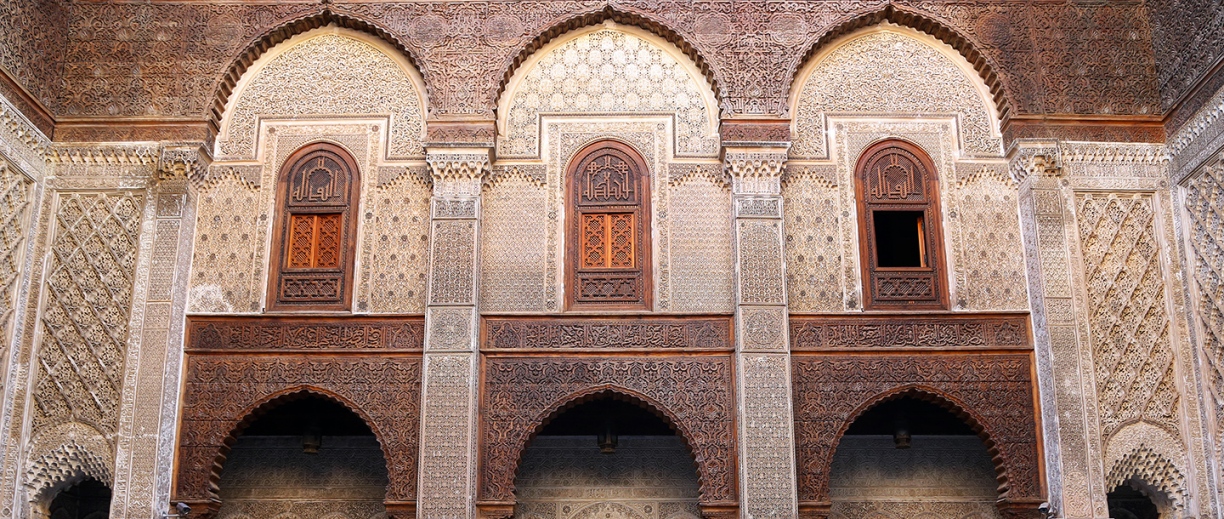 On now to the renowned Tanneries on the bank of the Oued Fes, despite the strong smell it is one of the most picturesque souks in Fez. You continue on through es-Seffarine and its brass workers, down the colourful es-Sebbaghine with its Street of the Dyers; and the Souq el-Atterine area of spices and groceries; to the exterior of the impressive al-Quarawiyyin Mosque and University and the el-Atterine Medersa (entrance fee included). This is considered one of the wonders of Moorish architecture - built between 1323 & 1325 by Merinid Sultan Abou Said Othman. You pass by the Tomb of Moulay Idriss, the second Idrissid ruler, considered to be the founder of Fez, restored in the mid-19th century to your final stop, the delightful el-Nejjarine Square with its fountain and caravanserai (entrance fee included).