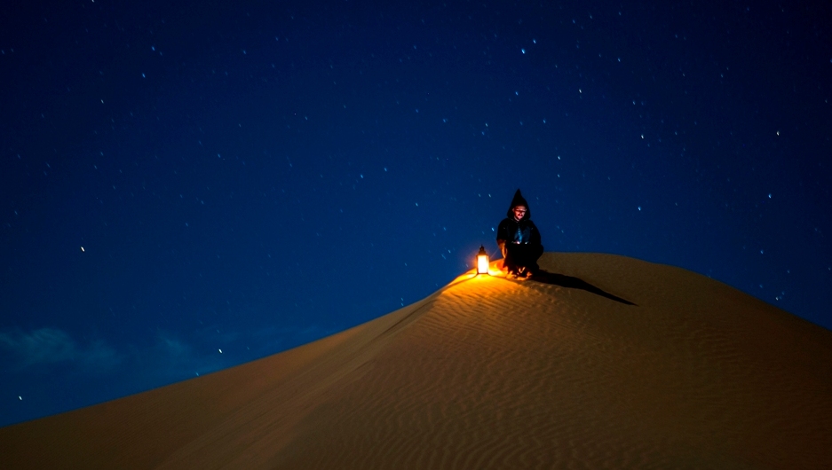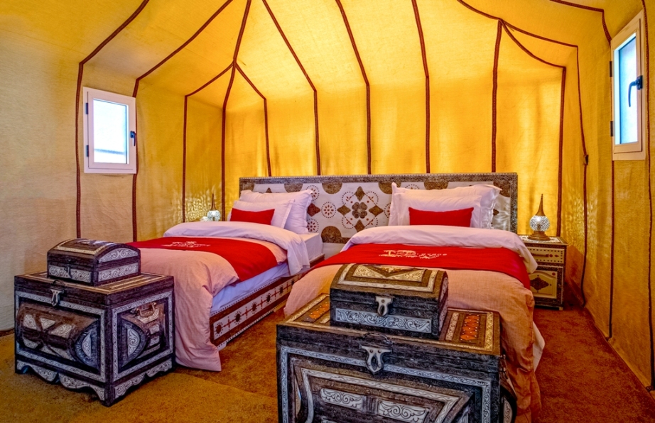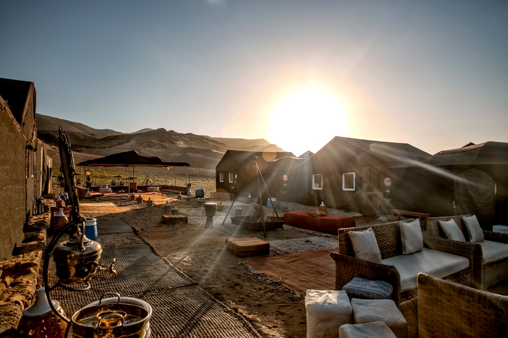 After a welcoming traditional glass or two of mint tea, your dinner will be served. This night may be spent in your tents or out in the open air under the awesome canopy of the starlit heavens around a blazing fire to witness the magnificent sunset, the rarefied heavens turning from bright blue to cobalt, to yellow to gold, to purple to black (the sands and stones change their colour too, in step with the lowering rays). Enjoy a convivial atmosphere around the fire to the sound of Sahraoui folklore.