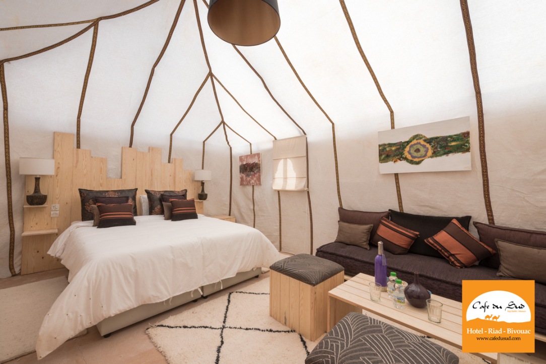 The Luxury Camp at Tislite Noumzar is an isolated Sahara camp, exclusive and private situated in the North East of Erg Chebbi. It’s tucked away with high dunes enclosing you on all sides, just a couple of hours by dromedary from the starting point of the Auberge. There are typical Moroccan white tents and nomad Berber tents made from traditional dark materials, with proper mattresses, sheets and blankets as well as electricity inside providing all the comfort and privacy needed to enjoy your experience. There are also shared, flushable western toilets and hot showers.