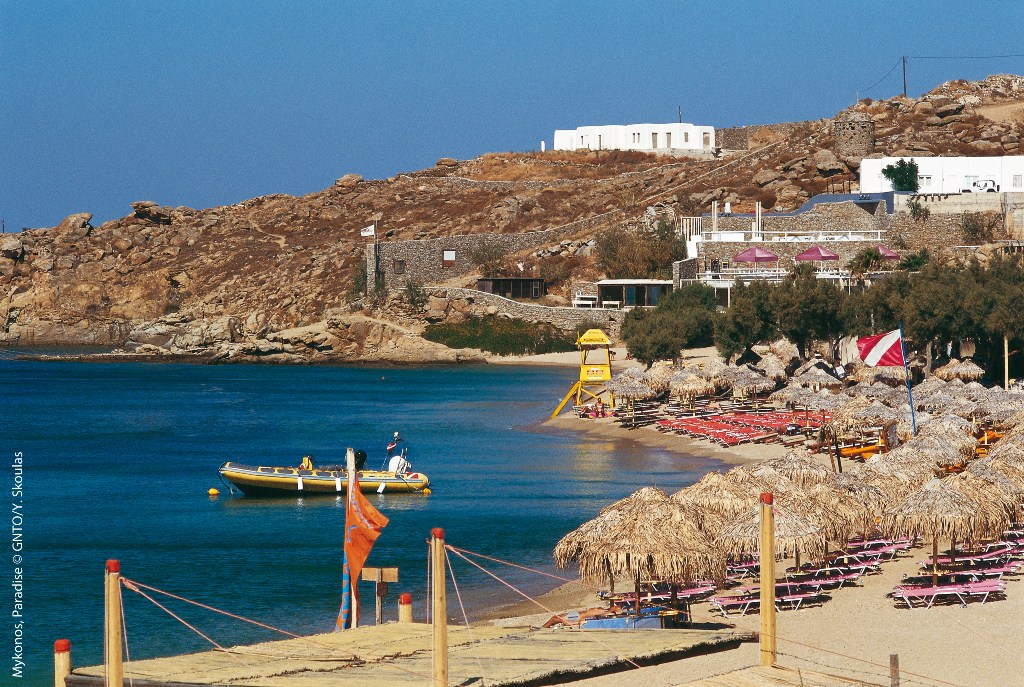 Platis Gialos' beach was awarded a Blue Flag some years ago and is well-equipped with sunbeds, umbrellas & watersports. It has a shallow shoreline too so it's also excellent for families. There is a good choice of places to stay here as well as tavernas and bars. Water taxis leave from here to go to the two most famous beaches on the island - Paradise and Super Paradise.