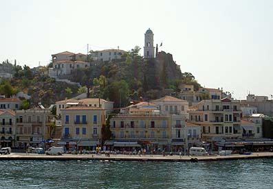 Poros Town has a mixture of traditional and neo-classical buildings; the bell tower is its most striking landmark.